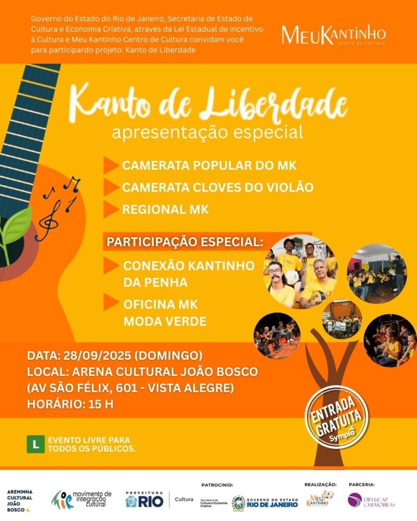 Neste domingo dia 28 de setembro, às 15h, a Arena Cultural João Bosco, em Vista Alegre, será palco da apresentação especial do projeto Kanto de Liberdade, realizado pelo Meu Kantinho – Centro de Cultura, que reúne música, arte, cidadania e educação em uma celebração aberta e gratuita ao público.